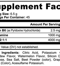 Ingredients: Vitamin B6 (as Pyridoxine Hydrochloride), L-Glutamine, BCAA 2:1:1, Citric Acid, Honeydew Flavor, Watermelon Flavor, Potassium Citrate, Silicon Dioxide, Sucralose, Sea Salt, Beet Powder (Color), Grape Skin Extract (Color), Acesulfame Potassium.