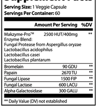 Ingredients: Makzyme-Pro™, Enzyme Blend (Fungal Protease from Aspergillus oryzae, Lactobacillus acidophilus, Lactobacillus cases, Lactobacillus plantarum), Bromelain, Papain, Fungal Lipase, Fungal Lactase, Alpha Galactosidase, Hypromellose (vegetable capsule), vegetable Magnesium Stearate, Silicon Dioxide.