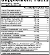 Ingredients: Vitamin C (as acerbic acid), Vitamin B6 (as Pyridoxine HCL), Choline (as choline bitartrate), Chromium (as chromium polynicotinate), Medium Chain Triglycerides Oil, CLA (Conjugated Linoleic Acid), GLA (Gamma-Linolenic Acid), Bladderwrack Thallus Powder, Inositol, Gymnema Sylvestre Leaf (25% Extract), Garcinia Cambogia Fruit Extract (50% hydroxycitric acid), L-Carnitine (as L-Carnitine Tartrate), Turmeric Root (95% extract), Coenzyme Q10, Proprietary Blend (Spirulina Powder, L-Phenylalanine, L-Tyrosine, L-Methionine, Bromelain, Psyllium Husk Powder, Clove Bud Powder,, Allspice, Kelp 10:1 Extract, Juniper Berry 4:1 Extract, Buchu Leaf 4:1 Extract, Uva Ursi Leaf (20% Extract), Cinnamon Bark 10:1 Extract (Cinnamomum cassia), Cranberry fruit Concentrate and Grapefruit Fruit 4:1 Extract), Gelatin (bovine), rice flour, vegetable magnesium stearate, silicon dioxide and chlorophyll.