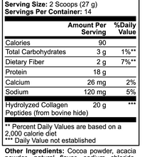 Ingredients: Hydrolyzed Collagen Peptides (from bovine hide), Cocoa Powder, Acacia Powder, Natural Flavor, Sodium Chloride, Xanthan Gum, Stevia Extract Powder (Reb A), Silica.