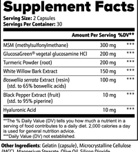 Ingredients: MSM (methylsulfonylmethane), GlucosaGreen® vegetal glucosamine HCl, Turmeric Powder (root), White Willow Bark Extract, Boswellia serrata Extract (resin)(std. to 65% boswellic acids), Black Pepper Extract (fruit) (std. to 95% piperine), Hyaluronic Acid, Gelatin (capsule), Microcrystalline Cellulose (MCC), Magnesium Stearate, Olive Oil, Silicon Dioxide.
