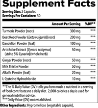 Ingredients: Turmeric Powder (root); Beet Root Powder (Beta vulgaris)(root); Dandelion Powder (leaf); Artichoke Extract (Cynara scolymus)(std to 5% Cynarin)(whole herb); Ginger Powder (root); Milk Thistle Powder; Alfalfa Powder (leaf); L-Cysteine Hydrochloride