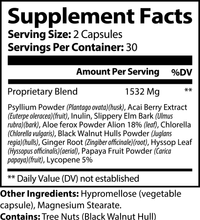 Ingredients: Proprietary Blend (Psyllium Powder, Acai Berry Extract, Inulin, Slippery Elm Bark, Aloe Ferox Powder Alion 18%, Chlorella, Black Walnut Hulls Powder, Ginger Root, Hyssop Leaf, Papaya Fruit Powder, Lycopene 5%, Hypromellose (vegetable capsule), Magnesium Stearate.